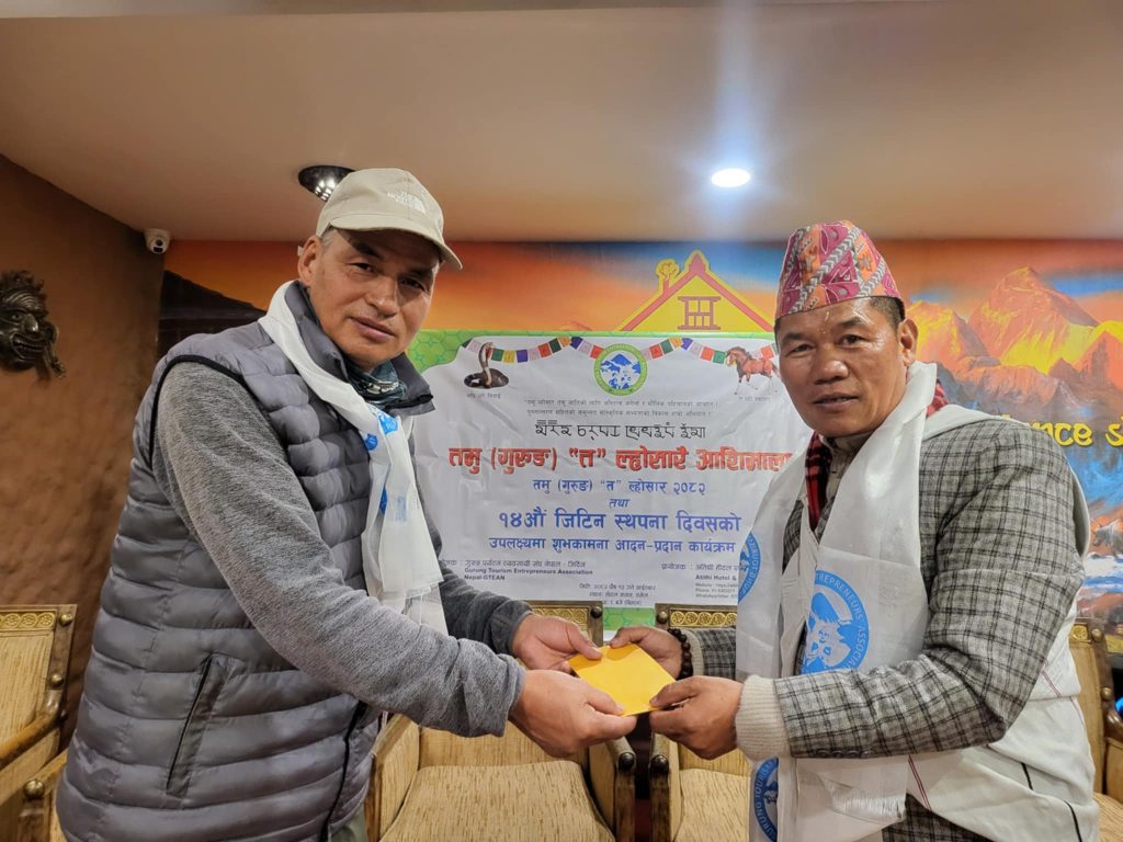 काठमाडौं । गुरुङ पर्यटन व्यवसायी संघ नेपाल (जीटिन)ले आफ्नो १४ औं स्थापना दिवस र तमू ल्होसार २०८२ को शुभकामना आदान प्रदान कार्यक्रम भव्य मनाएको छ । जिटिनले आज काठमाडौंमा एक भव्य कार्यक्रमको आयोजना गरी आफ्नो १४ औं स्थापना दिवस र तमू ल्होसार २०८२ शुभकामना आदान प्रदान कार्यक्रम मनाएको हो ।